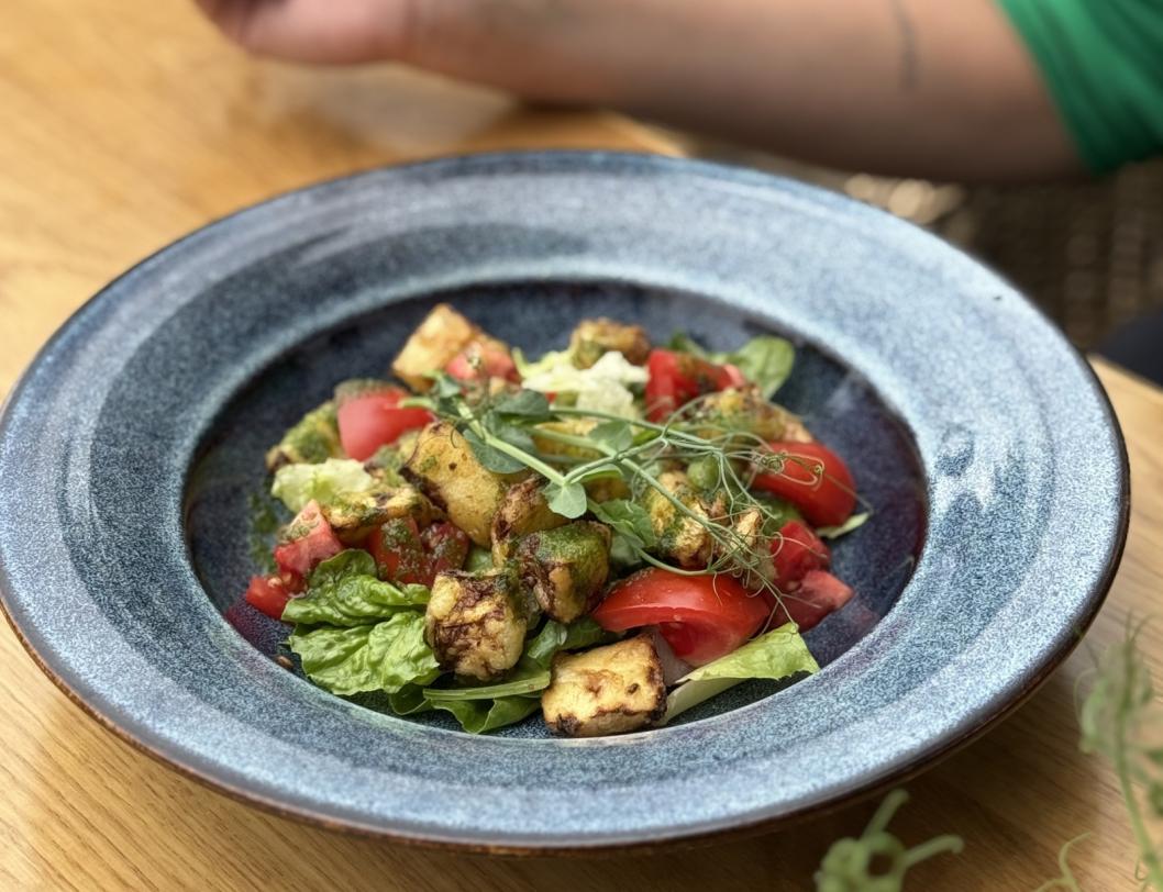 Промываем и рвем микс салатов романо и айсберг. Томаты режем ёлочкой. Кабачки рубим кубиками, обваливаем в крахмале и чесночной пасте и обжариваем в масле на сковороде. Все ингредиенты смешиваем и добавляем пряную заправку из растительного масла, свежего базилика и петрушки, сока лимона, соли, сахара и чеснока. Украшаем салат микрозеленью.