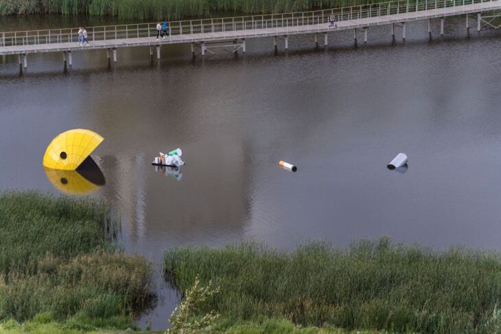 – Наш герой – объемный. И поглощает он не абстрактные точки, а вполне конкретный мусор. Пакман дрейфует на понтоне, словно движется в компьютерной игре и гонится за стаканом, упаковкой и огромным окурком, – рассказали в пресс-службе компании-застройщика.