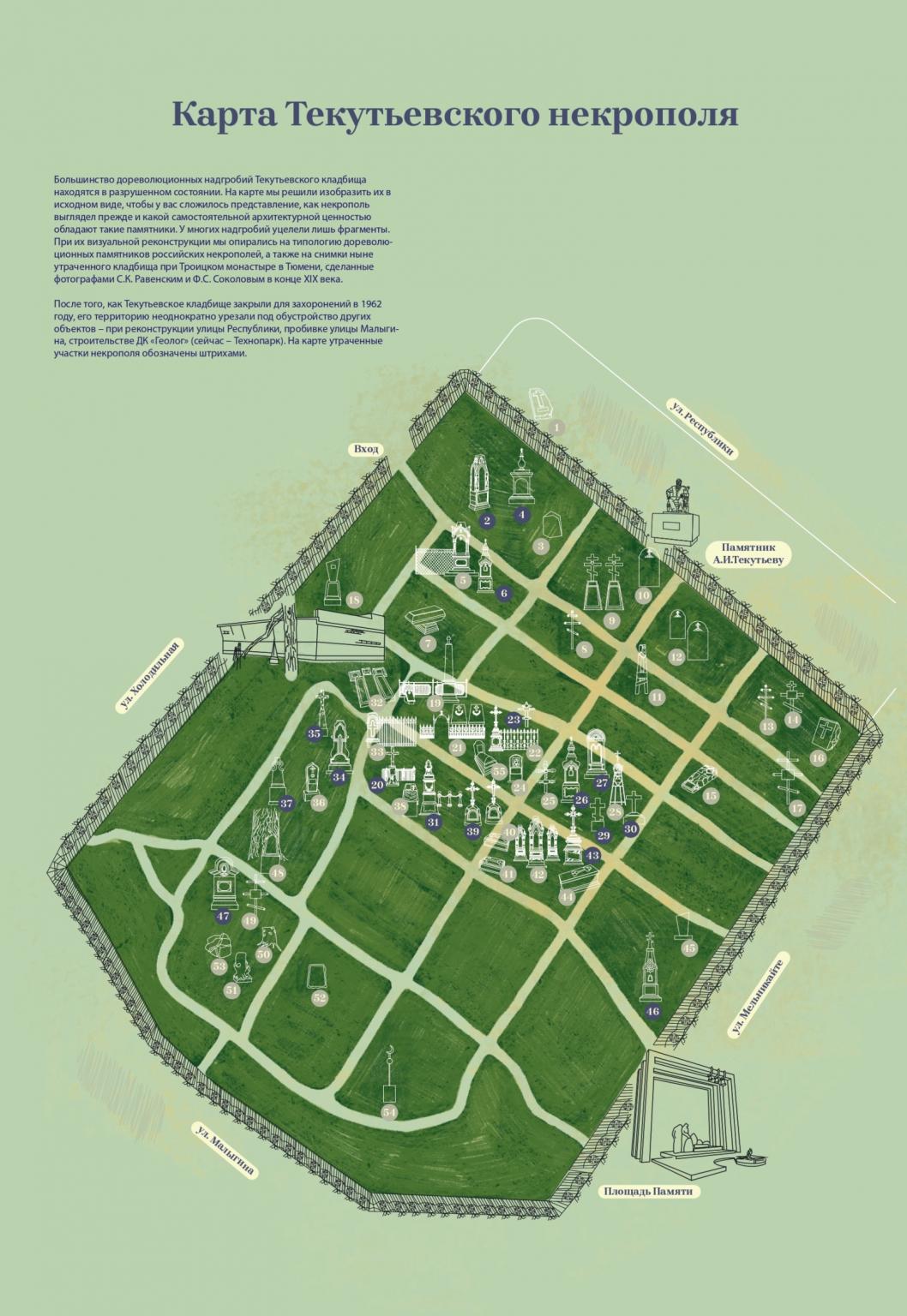 Сборник-путеводитель по Текутьевскому кладбищу был подготовлен командой авторов музея воспоминаний «Мы жили» в конце 2023 года. В книгу вошли биографии тюменцев, похороненных на старинном Текутьевском некрополе, классификация дореволюционных надгробий и небольшой раздел с описанием флоры кладбища. Дополнением к сборнику стала карта некрополя, на которой разрушенные старинные памятники изображены в исходном виде, чтобы у читателя сложилось представление, как кладбище, открытое в 1885 году, выглядело раньше.