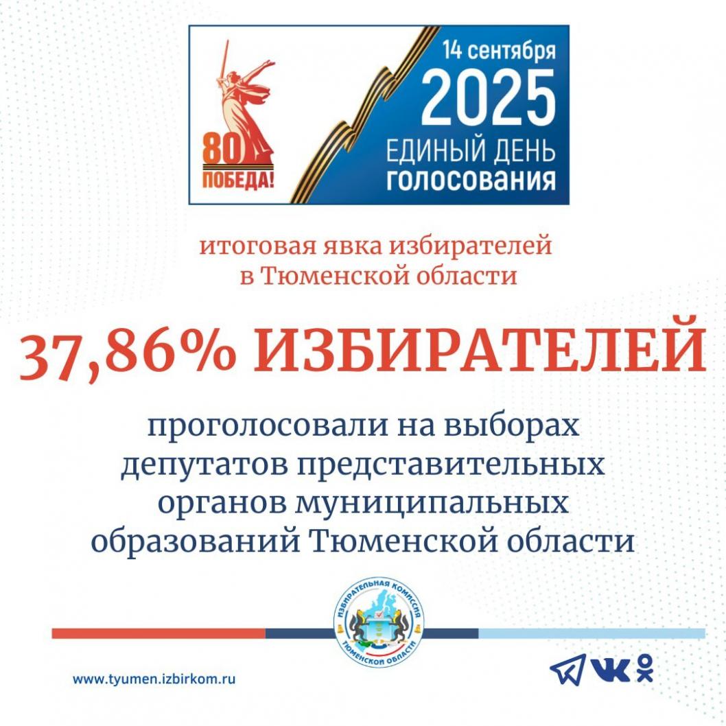 Итоговая явка на муниципальных выборах в Тюменской области в Единый день голосования 14 сентября составила 37,86%. Замещены все 374 вакантных депутатских мандата. Об этом 15 сентября на пресс-конференции сообщил председатель областной Избирательной комиссии Игорь Халин.