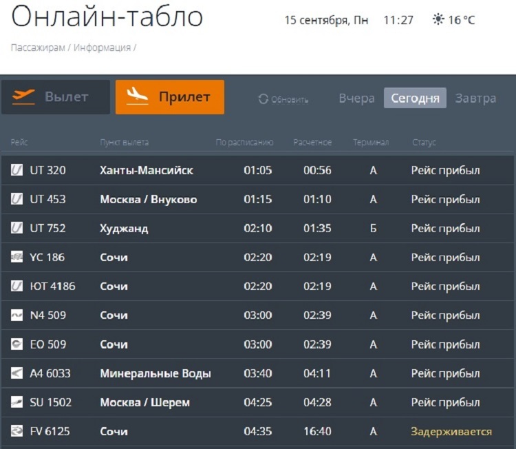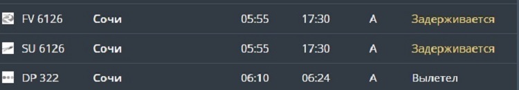Согласно данным воздушной гавани, Boeing 737 (FV 6125) из Сочи должен был вылететь в 4:35, но отложен на 16:40.