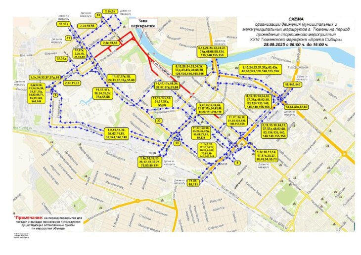 В следующее воскресенье, 28 сентября, в Тюмени состоится XXVI Тюменский марафон «Врата Сибири». В связи с проведением спортивного мероприятия будет временно прекращено движение транспорта в центре.