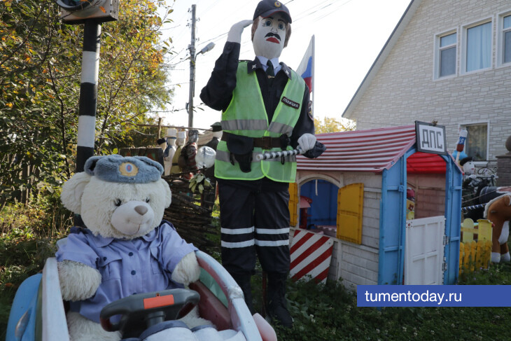 Страж дороги на посту в любую погоду. А чтобы не холодно было, да и для достоверности, переодевает его баба Аня в зимнюю униформу.