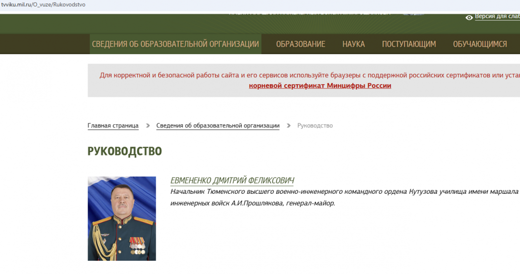 Начальник ТВВИКУ Дмитрий Феликсович Евмененко уволен в запас. Информацию изданию «Тюменская область сегодня» подтвердили в училище.