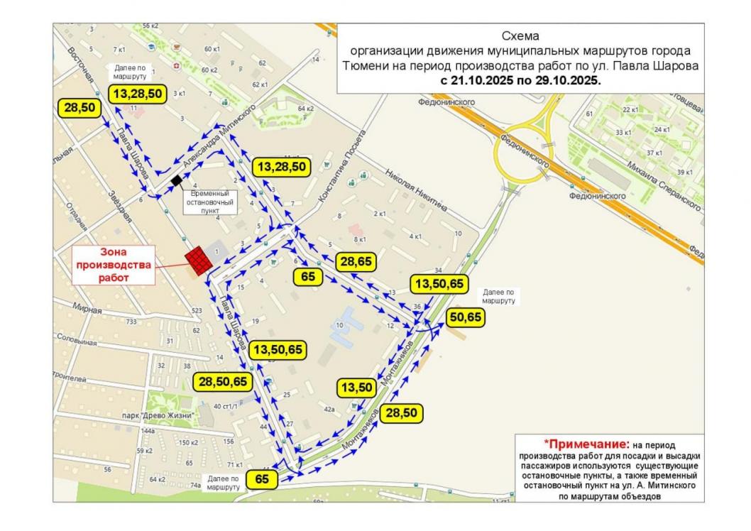 В Тюмени с 21 по 29 октября в связи с ремонтом на ул. Павла Шарова изменится схема движения общественного транспорта. Маршруты №13, №28, №50 и №65 будут следовать в объезд закрытого участка, при этом все существующие остановки сохранятся.