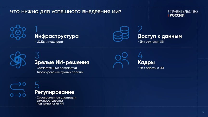 – Мы сделали единую площадку при Правительстве Российской Федерации, которая координирует эту работу. Как на федеральном уровне, так и на региональном у нас задачи по цифровизации любого ведомства, любого субъекта Российской Федерации содержат обязательным условием наличие каких-то программ, связанных с внедрением ИИ, – отметил вице-премьер правительства РФ.