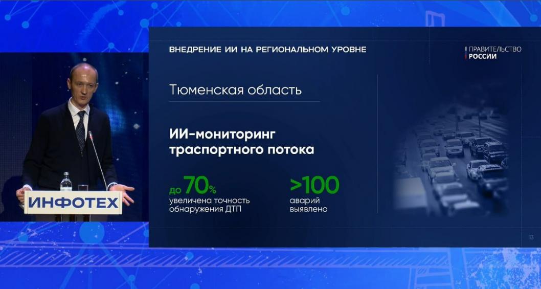 В пример применения технологии в регионах Дмитрий Григоренко привел ИИ-мониторинг транспортного потока в Тюменской области, АПК «Безопасный город».