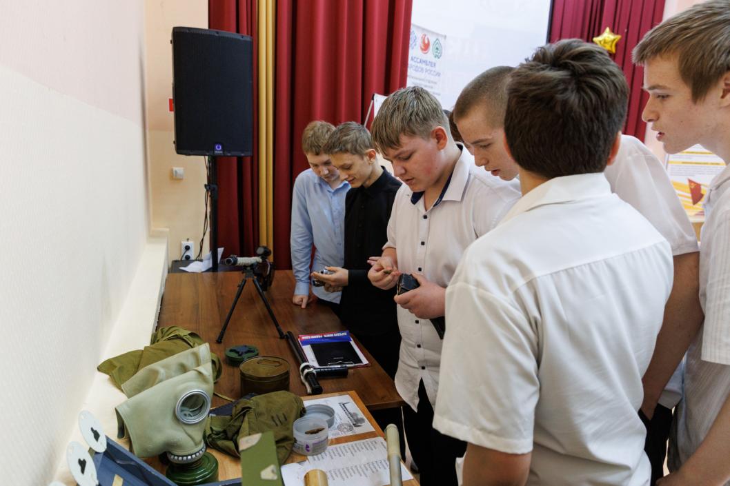 Интерактивным дополнением к живым рассказам стала небольшая выставка военного снаряжения и стрелкового оружия. Школьники с увлечением рассматривали экспонаты, могли подержать их в руках. А после урока окружили преподавателей в форме и продолжали задавать вопросы.