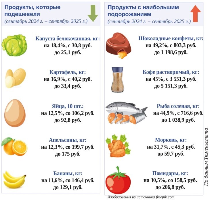Цены на продукты питания растут, заставляя тюменцев всё чаще задумываться о бюджете и экономии. Появляется вопрос: «Какую сумму придется потратить в магазине на этот раз?» С сентября 2024 года по сентябрь 2025-го, согласно данным Тюменьстата, больше всего выросла стоимость хлеба и моркови. // «Тюменская область сегодня»