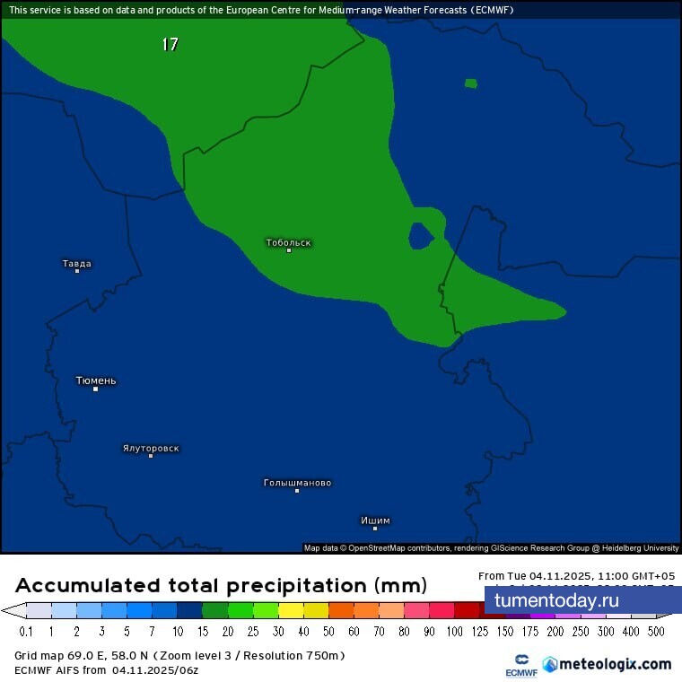 – На севере Тюменской области ожидается больше осадков – до 15-20 мм. На карте показан прогноз общего количества осадков до вечера 8 ноября, – рассказал Иван Винштейн в своем телеграм-канале.