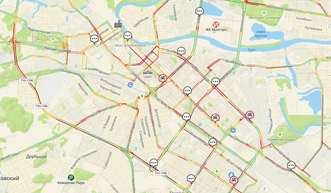 Многочисленные заторы образовались по всему городу. Так, например, водители застряли на улицах Республики, Профсоюзной, 50 лет Октября, Мельникайте, Ленина, Челюскинцев, Пермякова, Широтной, Московском и Червишевском трактах, а также на объездной дороге от улицы Ямской до пересечения Федюнинского и Монтажников.