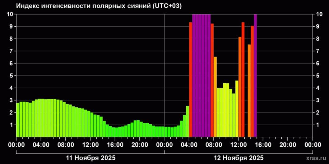 Специалисты также отметили, что геомагнитный индекс 12 ноября достигает уровня G3-G4 по шкале силы магнитных бурь, при максимальном G5. При этом зарегистрированный пик, G4.7, уже является самым большим значением в текущем году.