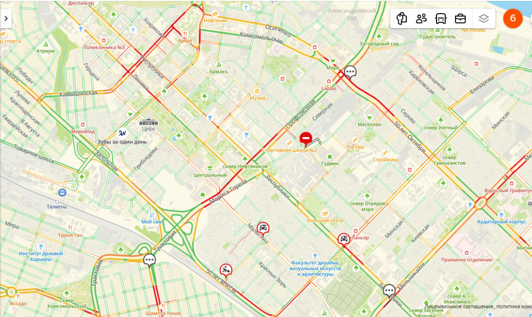 Затор на 50 лет ВЛКСМ, Мориса Тореза, Ленина, Челюскинцев, перекрестке Республики – Холодильная и 50 лет Октября – Профсоюзная.