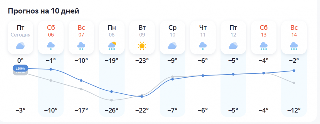 Если суббота продержится примерно в тех же значениях, то в воскресенье и понедельник температура резко упадет сначала до -13...-16, а затем до -21…-26 соответственно (комфорта – аж до -31). Ветер, впрочем, будет слабым – 4-5 м/с. Несильно лучше ситуация во вторник, 9 декабря.
