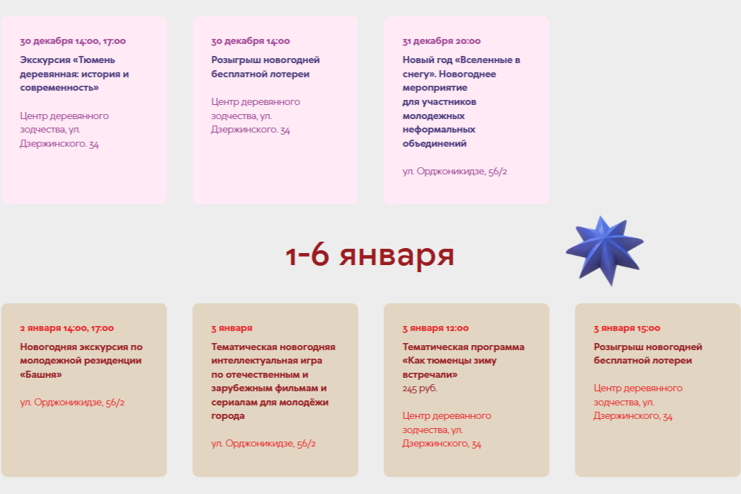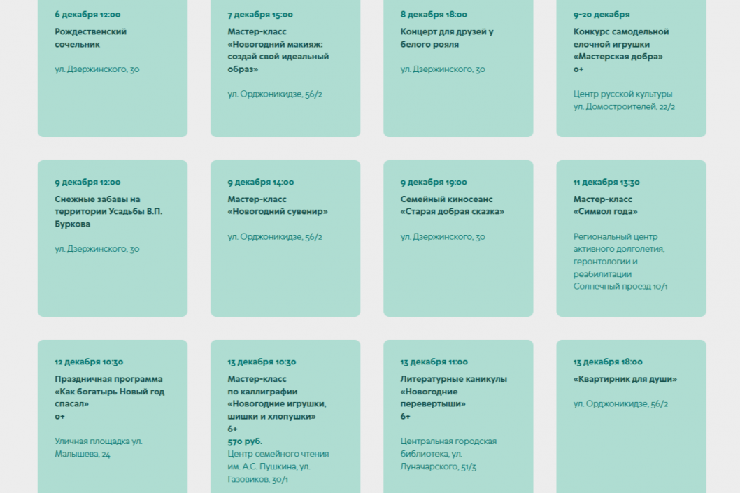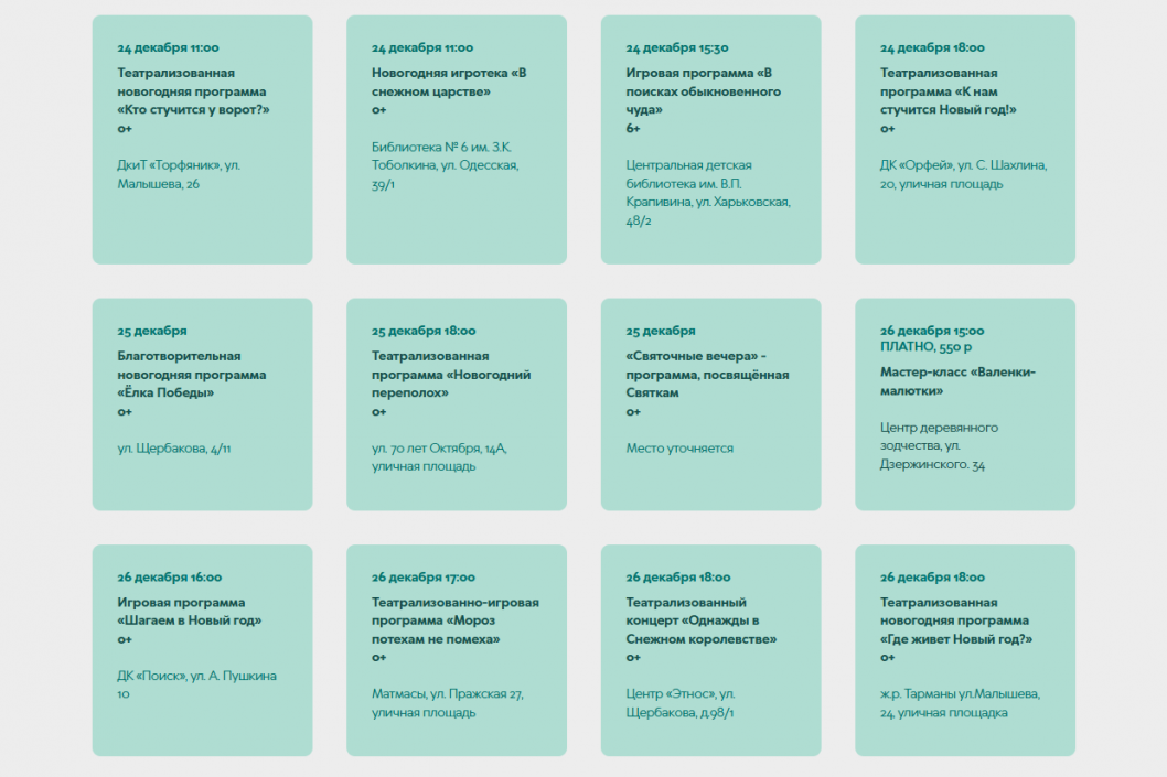 На ресурсе можно найти полную программу новогодних и рождественских событий: от спектаклей и мюзиклов до семейных мастер-классов и игровых программ. Кроме того, на портале доступен подробный новогодний справочник с информацией о всех городских ледяных горках, главных ёлках, ёлочных базарах и работе резиденции Деда Мороза.