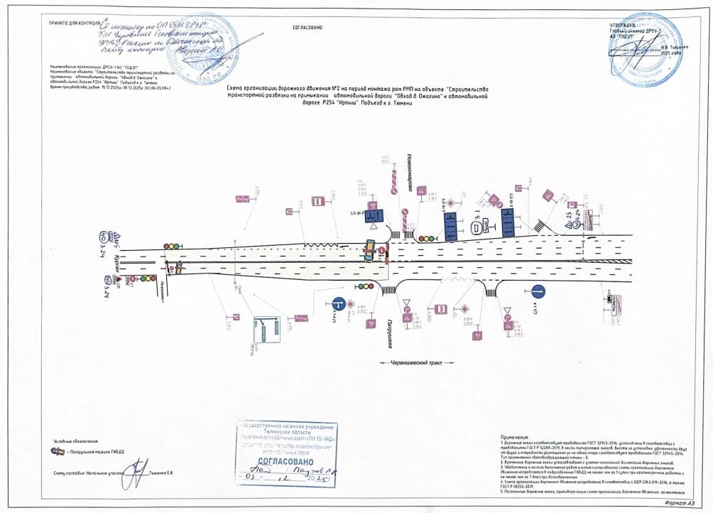 18 декабря в это же время перекроют движение на участке от путепровода новой транспортной развязки в сторону Тюмени до светофора (Р-254 «Иртыш» ПК 5+00 - ПК 10+82).