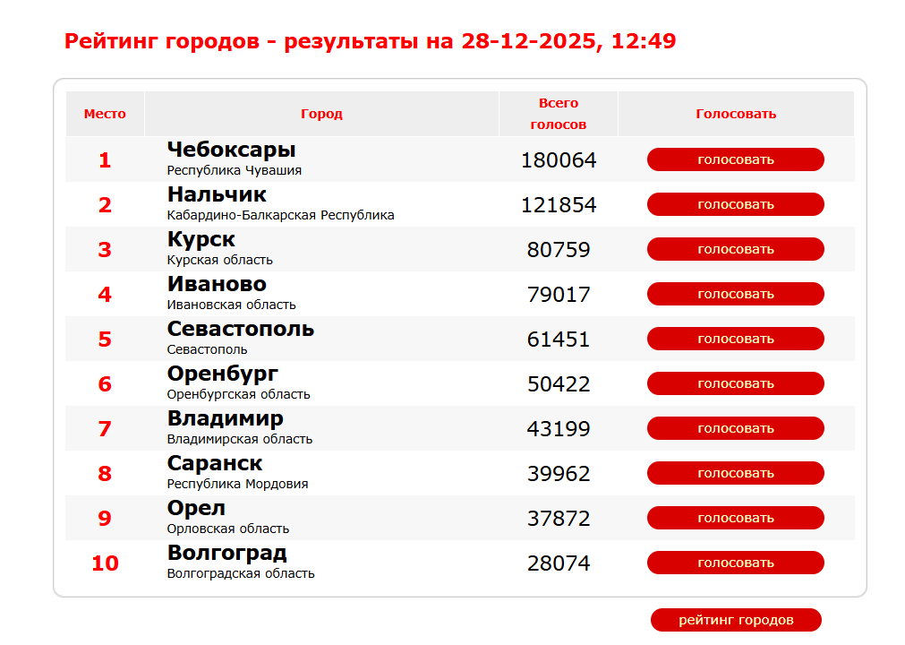 Тройку лидеров конкурса сейчас составляют Чебоксары, Нальчик и Курск.