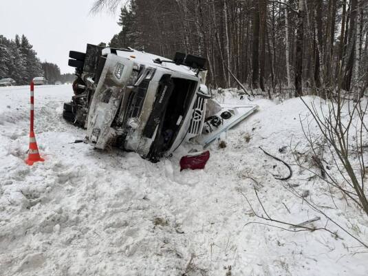 На трассе под Тюменью большегруз опрокинулся из-за легковушки