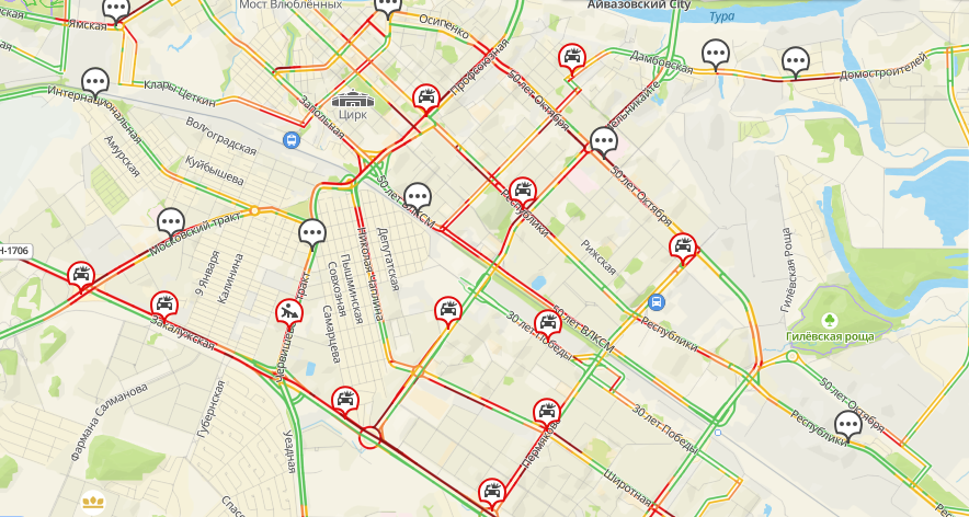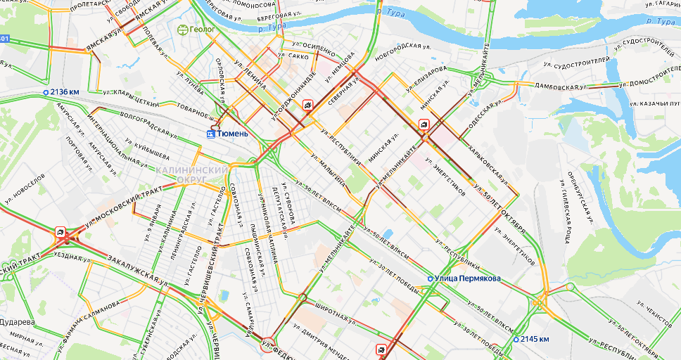 Особенно сложная ситуация сложилась в центре города, а также на мостах через Туру – пробки 10 баллов. Снегопад, который сковал город, начался днем и закончится, согласно прогнозу сервиса «Яндекс.Погода», ночью, около 23:00.