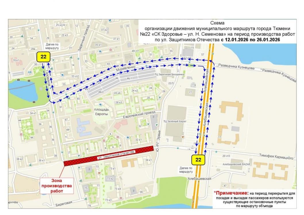Тюменский маршрут общественного транспорта №22 временно изменит схему движения. Изменения будут действовать с 12 по 26 января 2026 года, об этом сообщили в администрации города.