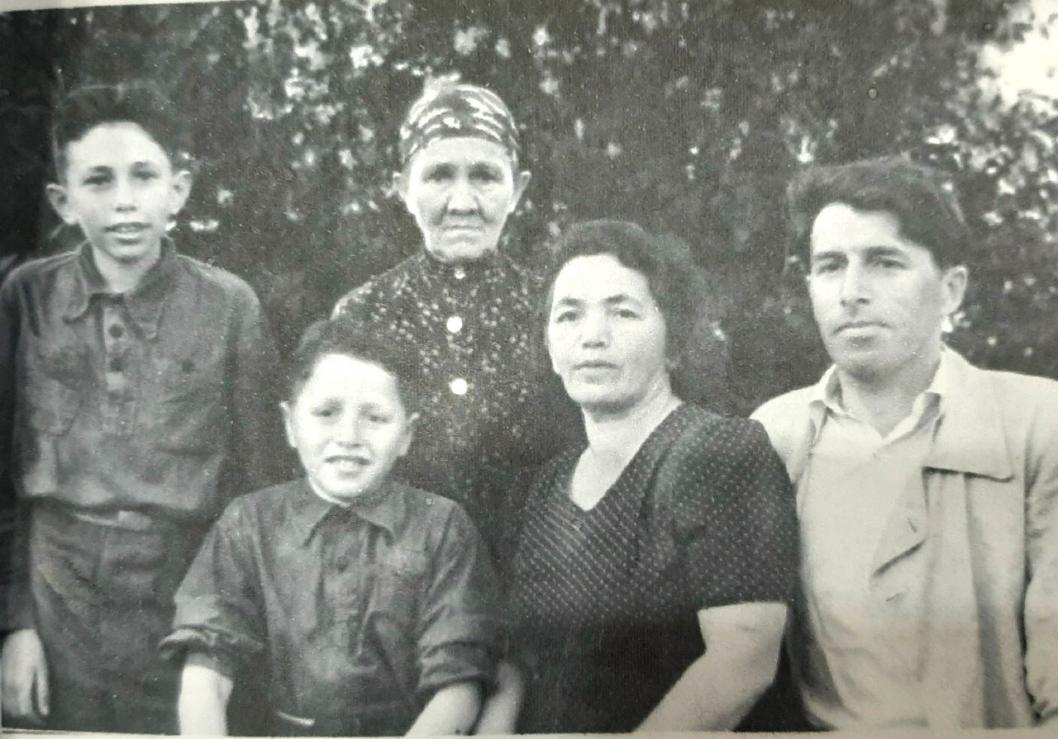 Перед отъездом в Ленинград. Слева направо: сидят – Владимир Гесин, его мама и папа, стоят – Яша Сикирин и хозяйка-бабушка. Ембаево, май 1945 года | Фотография из архива Ембаевского краеведческого музея