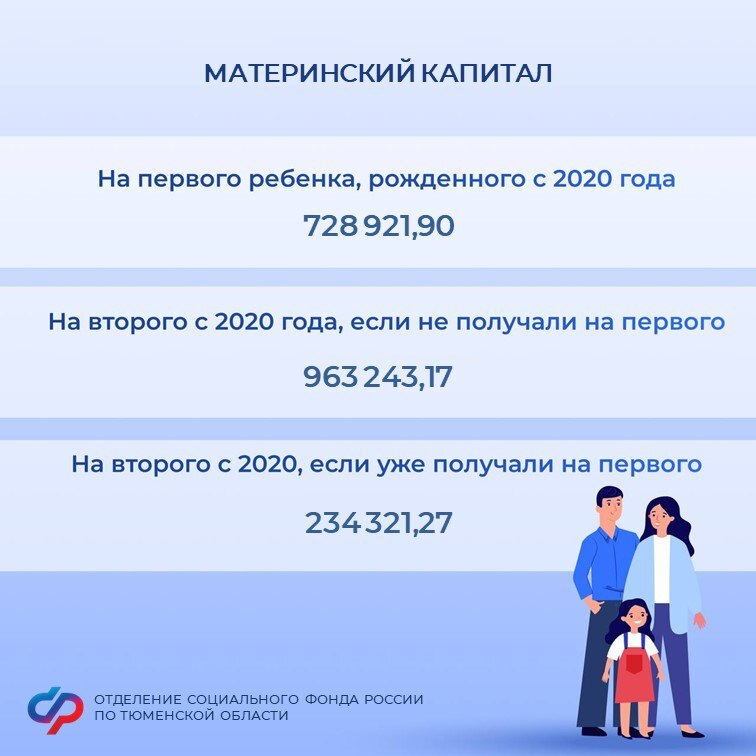 С февраля маткапитал на первого ребенка составляет 728 921,9 рублей. Такая же сумма полагается семьям с двумя детьми, если второй ребенок рожден или усыновлен до 2020 года, а родители еще не оформляли или не использовали материнский капитал.