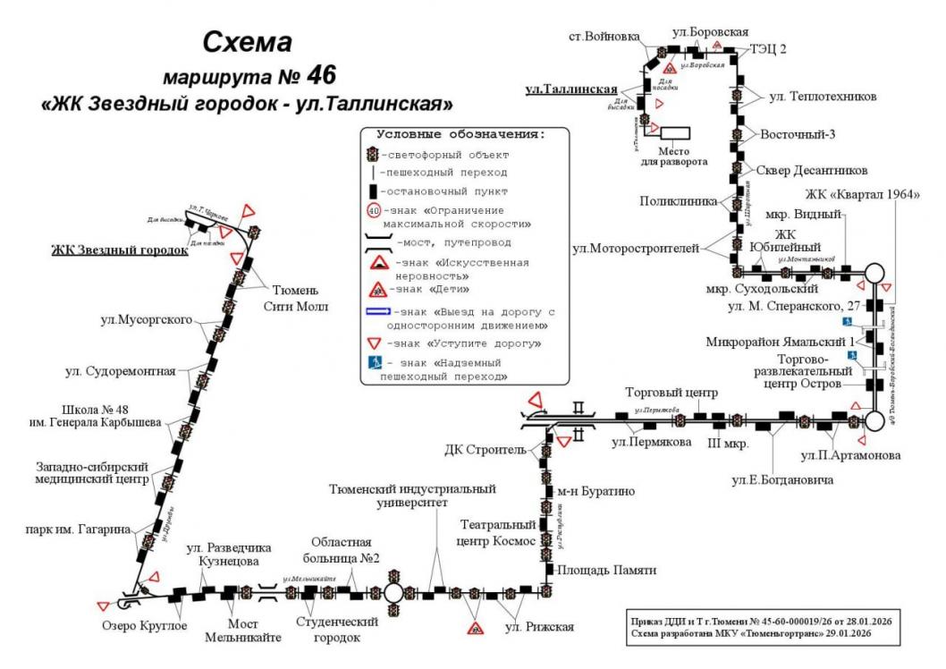 С 14 февраля 2026 года в схему движения автобусного маршрута №46 «ЖК «Звездный городок» – ул. Таллинская» внесены изменения. Об этом сообщают в МКУ «Тюменьгортранс».