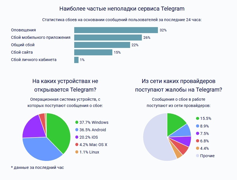Согласно статистике, сбои чаще всего происходят в мобильной версии мессенджера: 36,5% жалоб поступило с Android, 20,2% – с iOS. О сбоях на компьютере пожаловались 42,3% пользователей. Наиболее распространённой проблемой стали неработающие оповещения (32%), следом идет сбой мобильного приложения (26%) и общий сбой работы сервиса (22%).