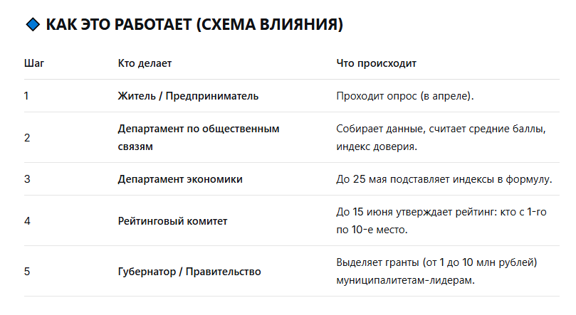 Что происходит дальше. Ваше мнение формирует показатель «Уровень доверия к власти» (Ипi16). Этот индекс имеет вес 0,25 (25%) в итоговой формуле рейтинга. Он влияет на то получит ли администрация муниципалитета грант на развитие территории – до 10 млн рублей.