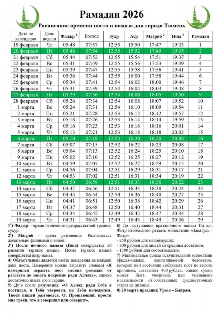 Публикуем расписание времени поста и намаза для Тюмени: