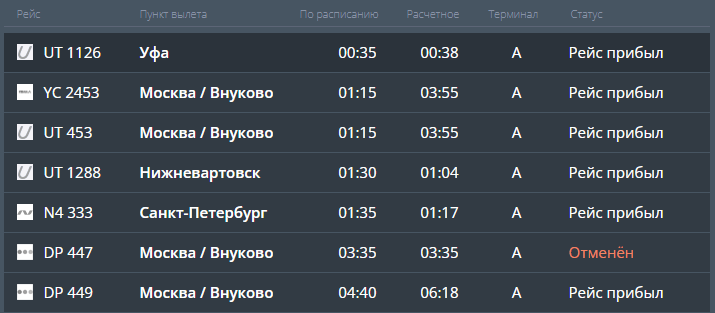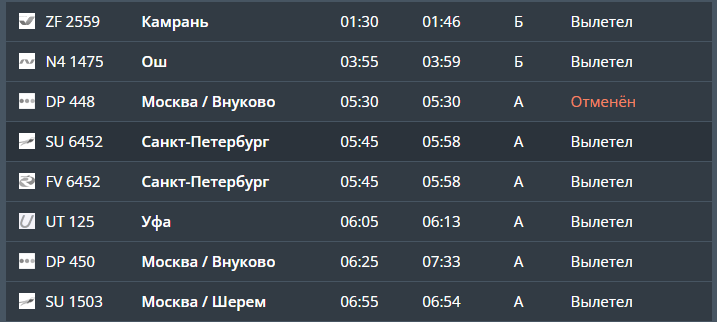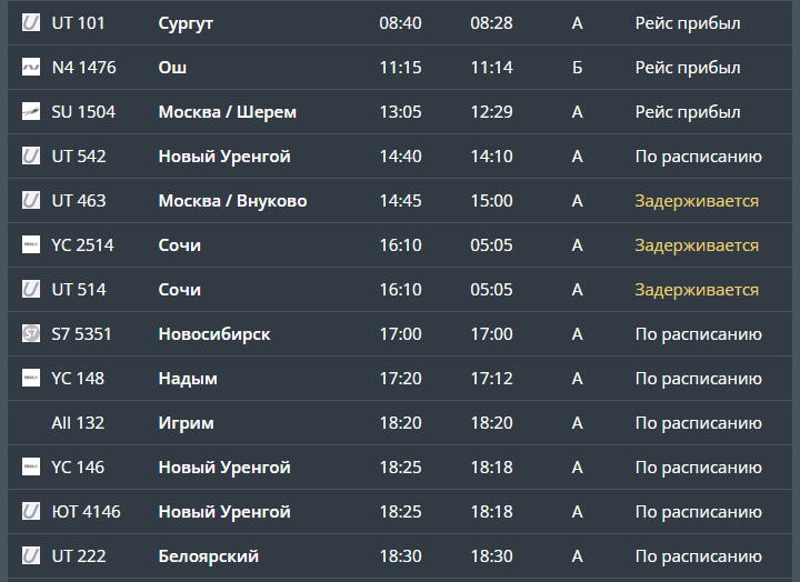 Скриншот онлайн-табло аэропорта Рощино