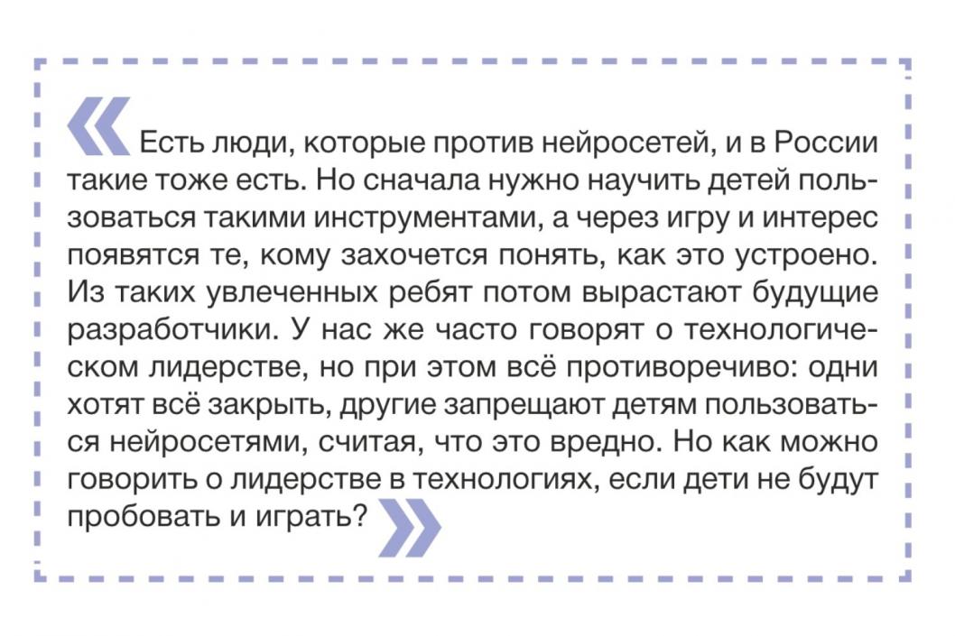 – Думаю, будет полная интеграция ИИ в жизнь людей. Нейросети останутся, возможно, можно будет генерировать в виртуальной реальности. Создать цифровые пространства, в которых можно гулять или летать, а не просто смотреть нарисованное. Это интересно – быть сразу в двух мирах.