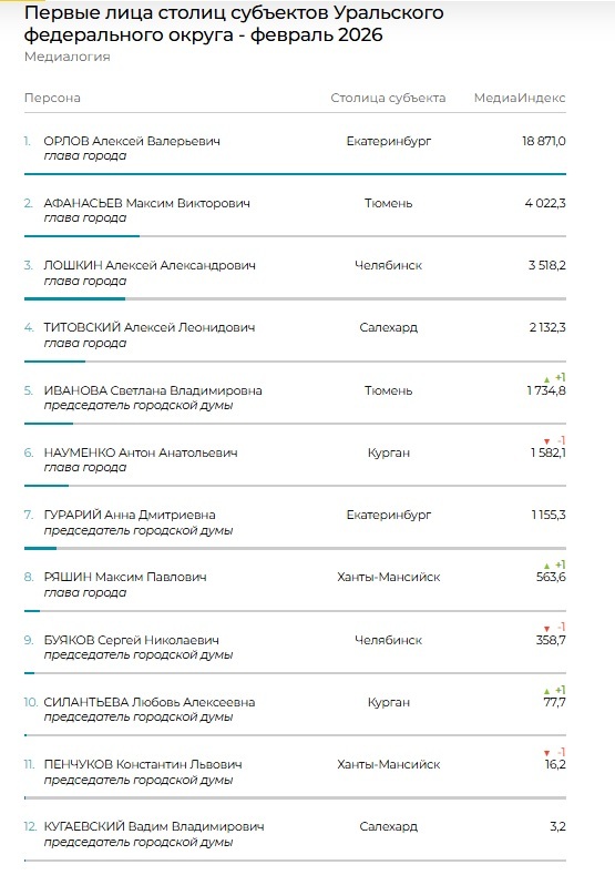 Председатель Тюменской городской Думы Светлана Иванова поднялась на один пункт и заняла пятую строку рейтинга. За ней следует руководитель Кургана Антон Науменко, председатель гордумы Екатеринбурга Анна Гурарий, глава Ханты-Мансийска Максим Ряшин. Замыкают топ председатели гордум Челябинска Сергей Буяков, Кургана Любовь Силантьева, Ханты-Мансийска Константин Пенчуков и Салехарда Вадим Кугаевский.