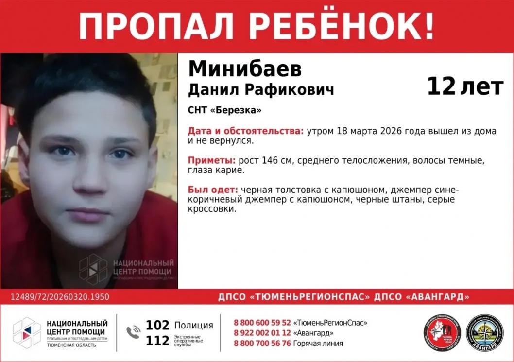 В Тюмени и области идут поиски 12-летнего Данила Минибаева. Утром 18 марта он вышел из дома в СНТ «Березка» и не вернулся, сообщает добровольческий поисково-спасательный отряд «Тюмень Регион Спас».