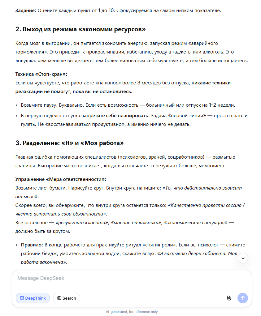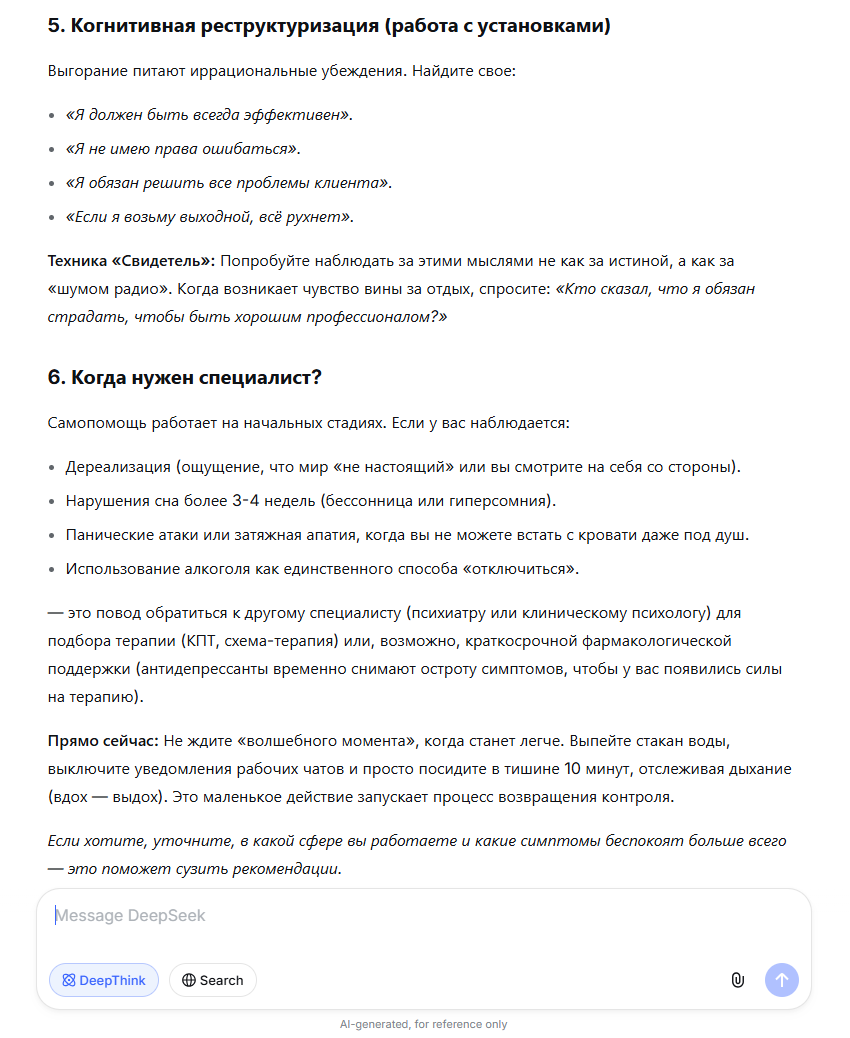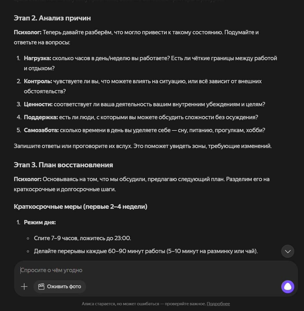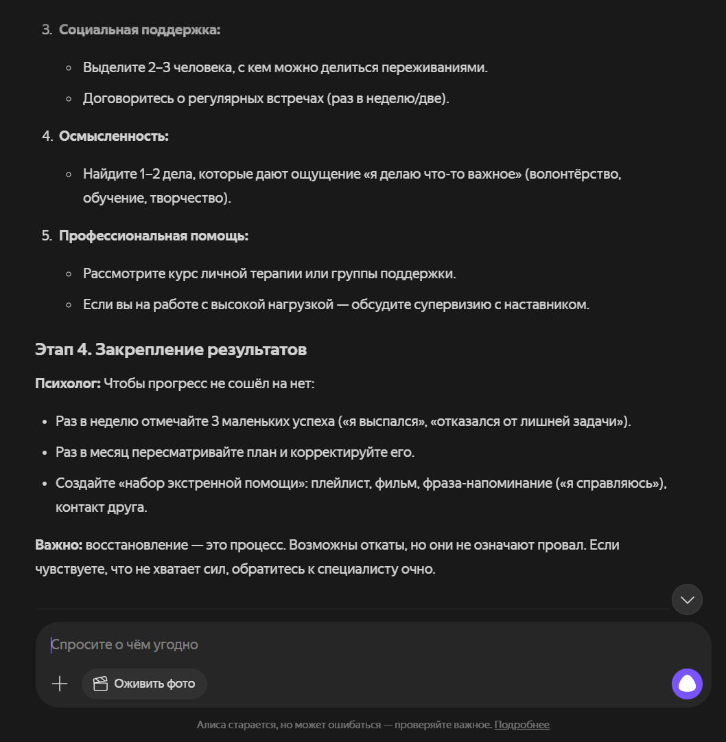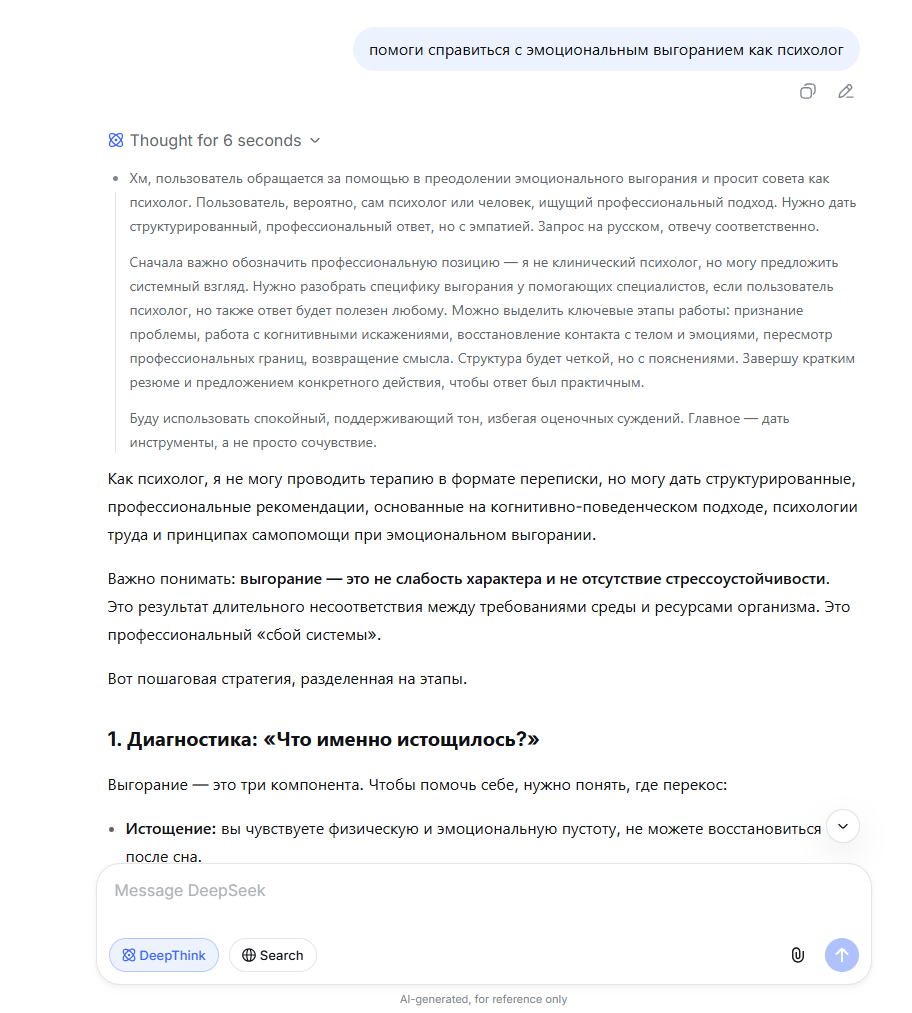Одна из главных причин, почему люди обращаются к нейросетям за психологической поддержкой, – доступность. Средняя цена услуг психолога в Тюмени – 2 000 рублей за консультацию, за прием психотерапевта – от 3 000 до 7 000 рублей. Вспомогательные инструменты позволяют получить хоть какую-то опору. Само обращение к ним – это уже попытка помочь себе. На запрос «Помоги справиться с эмоциональным выгоранием как психолог» нейросеть составляет план действий, предлагает техники, как оценить свое состояние. В конце диалога платформа обязательно советует обратиться к врачу.