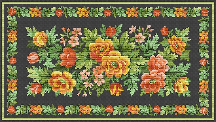 – Еще наши бабушки в советское время очень часто воспроизводили этот ковер. У него классический черный фон, но он буквально переполнен изобильной зеленью и цветами. Здесь есть пионы, яблоневый цвет и маки, роз нет, зато много красивых дубовых листочков. Такой яркий цветочный букет, – описывает работу руководитель мастерской.