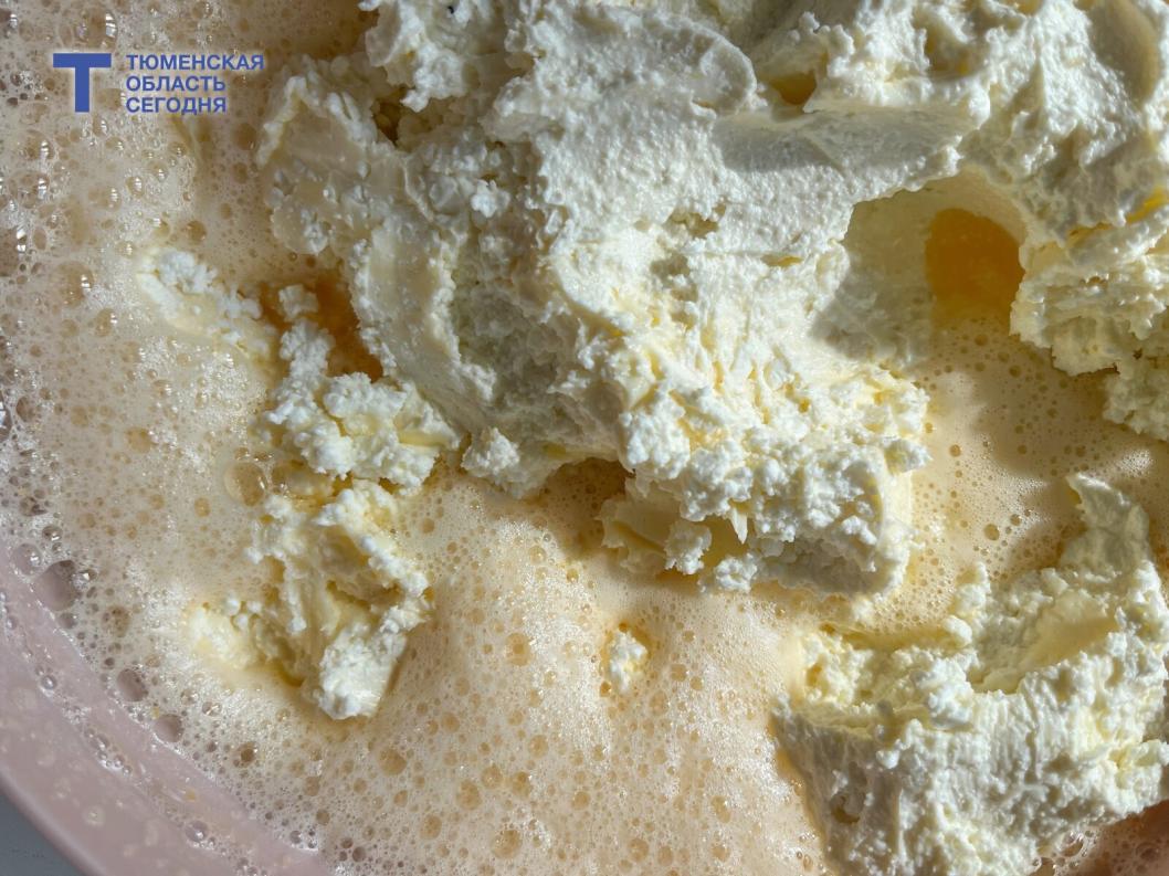 1. Сначала взбейте яйца и сахар в большой миске до образования плотной пены. Добавьте в эту смесь перетертый творог и мягкое сливочное масло. Кстати, вы можете упростить себе задачу и купить творог в брикетах – там он как раз нужной консистенции.