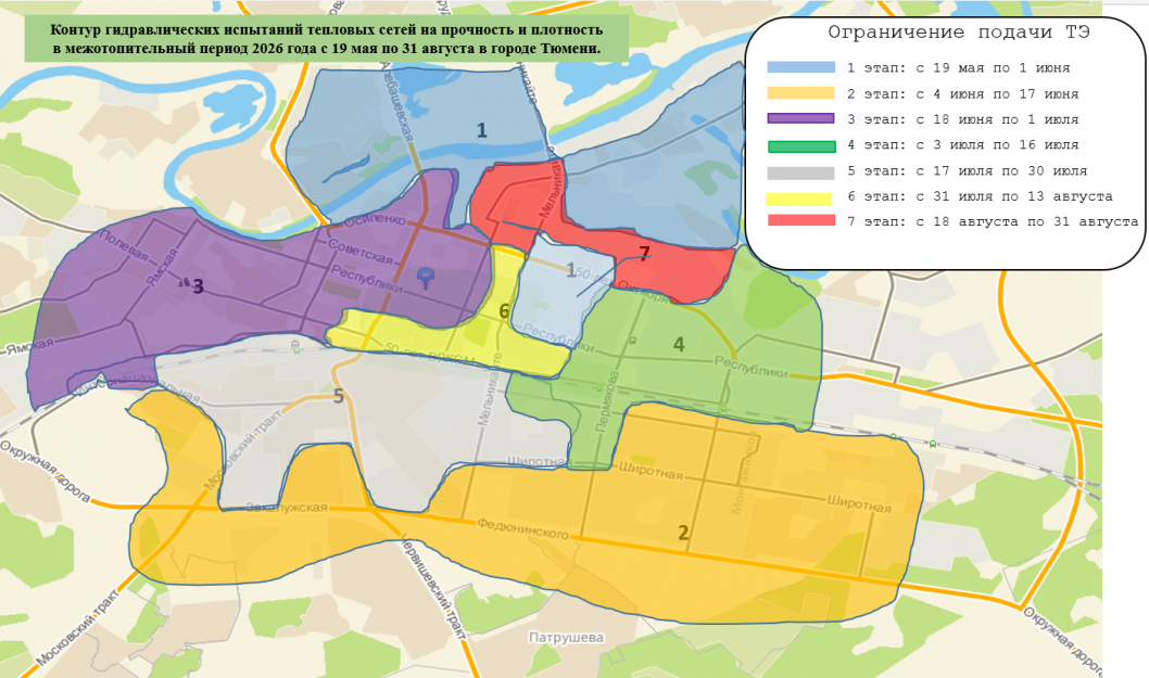 В Тюмени стартуют ежегодные гидравлические испытания тепловых сетей в межотопительный период 2026 года. Работы начнутся 19 мая и продлятся до 31 августа. На это время в ряде районов города будет временно отключено горячее водоснабжение.
