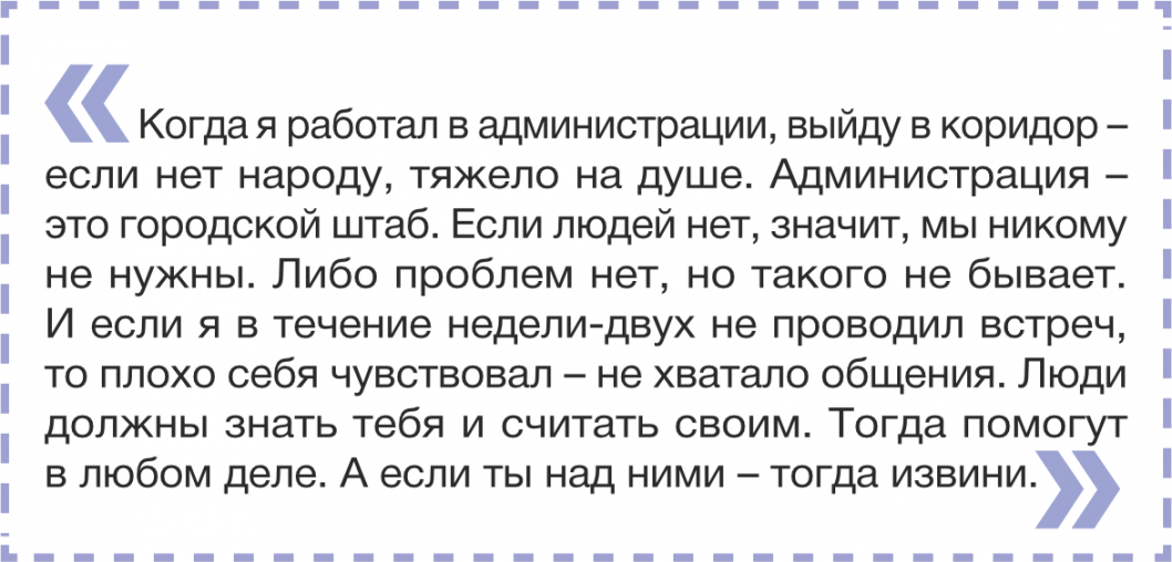 – Да. После меня выступили ветераны. Они знали моего отца – он был активным организатором создания колхозов. Сказали: если такой же, то другого нам не надо. Поддержали. Это опять же связано с корнями. Секретарь горкома тогда сказал: «Там ведь помнят о твоем отце. Иди, продолжай его дело». Избранный должен опираться на людей, быть с ними, а не над ними. Я следил, чтобы они не чувствовали во мне начальника, который рычит и ругает. Надо жить их заботами, тревогами, радостями. Люди должны знать, что делает их избранник, и иметь возможность высказать мнение.