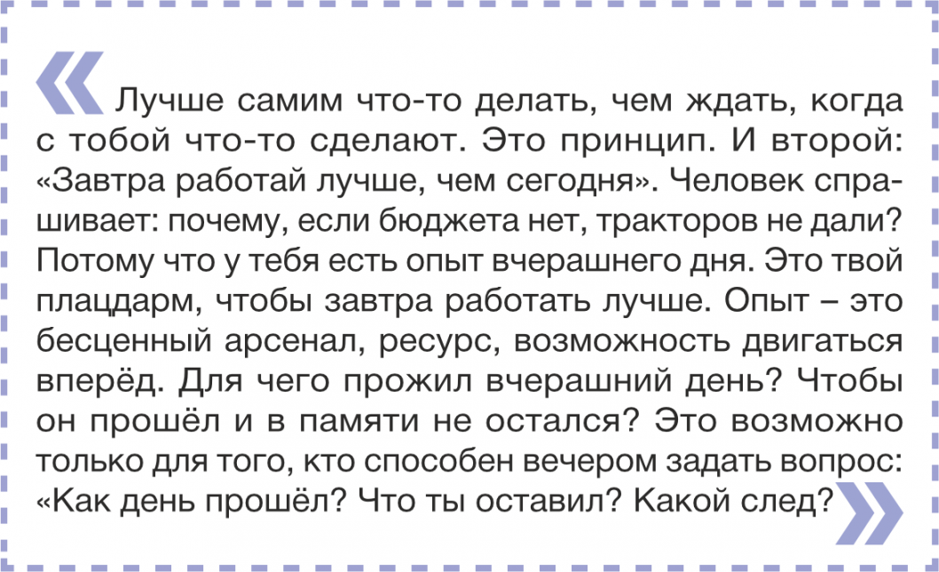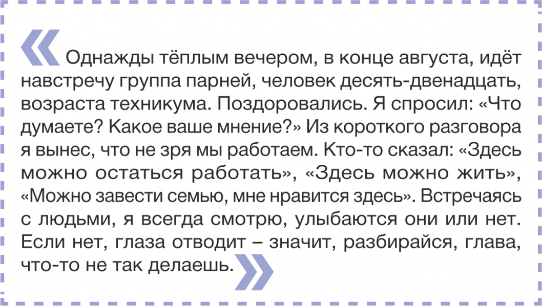 – Что такое успех? Молодой человек окончил школу, поступил в учебное заведение, хорошо сдал экзамены, получил специальность. Разве это не успех? Первая ступенька. Дальше: создал крепкую, дружную семью, детей достойно воспитал – это не успех? А если еще многодетная семья – тем более успех. Начал свое дело, оно развивается, появились помощники или ты на хорошем счету на работе, тебе ставят ответственные задачи, ты поднимаешься по службе – это успех. Какая разница, какая территория? Всё зависит от амбиций человека. Я считаю, что малая родина ни в коей мере не ограничивает горизонты.