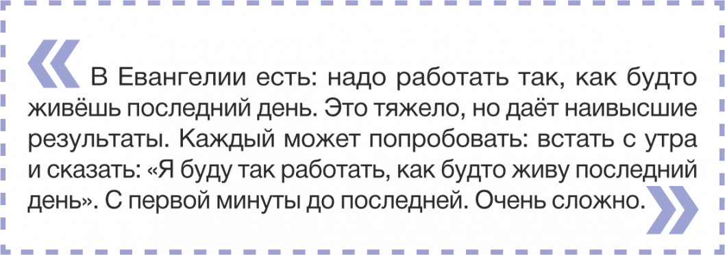 – У Петра Первого в книге, которую мне подарил Даниил Гранин, есть фраза: Пётр думает, царское ли дело смотреть, как топор заточен, как бревно тешут. И сам отвечает: «А если я не буду этим заниматься, кому это еще надо?» А Суворов говорил: солдат должен знать свой маневр – в этом его непобедимость. Это поясняет логику действий того, кто пытается хорошо делать дело.