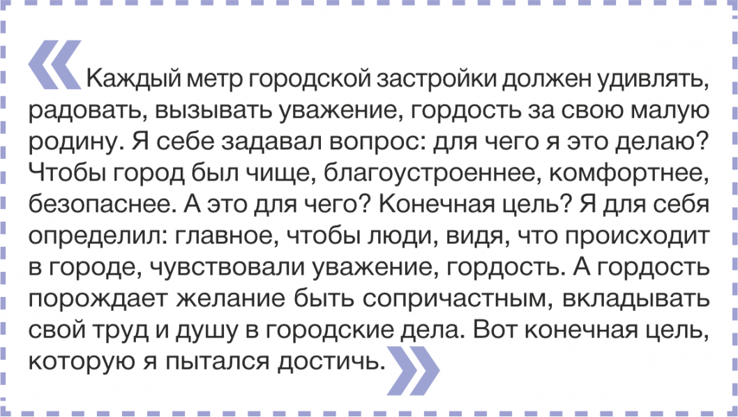 – Человеку свойственно с течением времени всё оценивать критически. Скажу так: кардинально ничего бы менять не стал. Надо было, наверное, чуть тверже руль держать, чтоб не рыскать. Но город мы вывели на серьезный уровень.