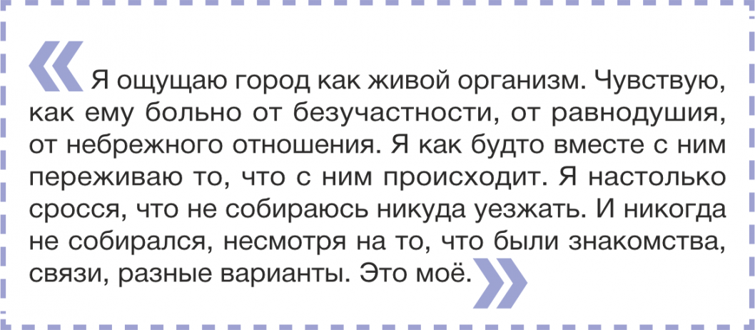 – Любовь во многом обусловлена корнями. Это мое отношение к городу и, наверное, многих людей. Можно приехать в другое место и обрести чувство родины. Я не исключаю этого. Так часто происходит с людьми. Земля встречает их, складываются благоприятные обстоятельства, человек пускает новые корни и, соответственно, начинает чувствовать к этой земле уважение и, может быть, даже более глубокие чувства.