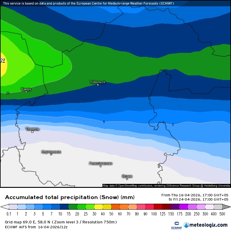 В Тобольске снежный покров может сформироваться высотой до 10–15 см. К утру 21 апреля на севере региона высота снега достигнет около 10 см.