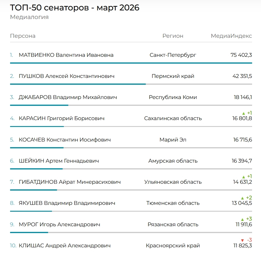 Открывает топ традиционно Валентина Матвиенко (Санкт-Петербург). За ней следует Алексей Пушков из Пермского края. На третьей строке – Владимир Джабаров (Республика Коми). Плюс один пункт и на четвертой строке расположился Григорий Карасин (Сахалинская область). За ним следуют Константин Касачев (Марий Эл) и Артем Шейкин (Амурская область).