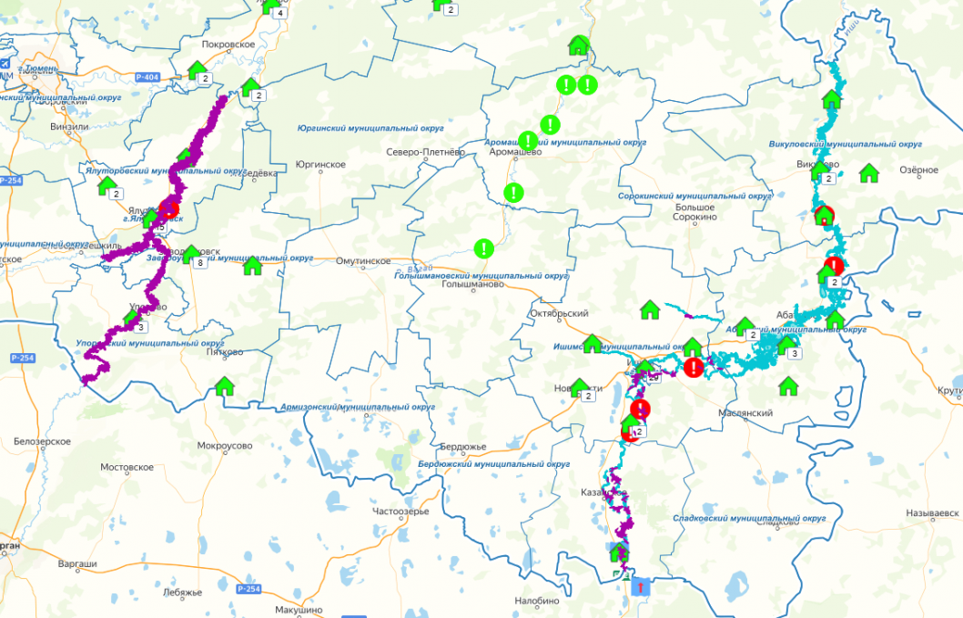 Геопортал Тюменской области показывает подтопленные территории в Ялуторовском, Упоровском и Заводоуковском округах, а также в Ишимском и Казанском округах.