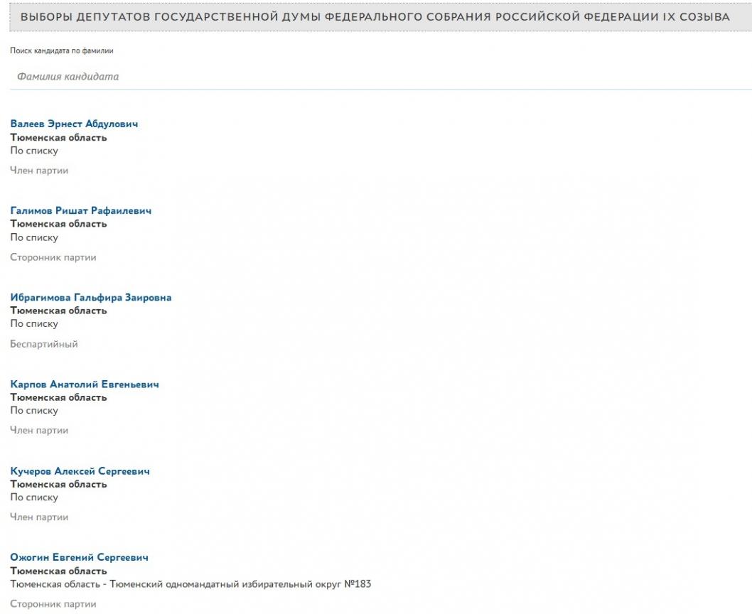 На данный момент на сайте значится 88 кандидатов от Тюменской области. Шесть из них – в Госдуму. Также в этом списке кандидаты на довыборы в окружные Думы.