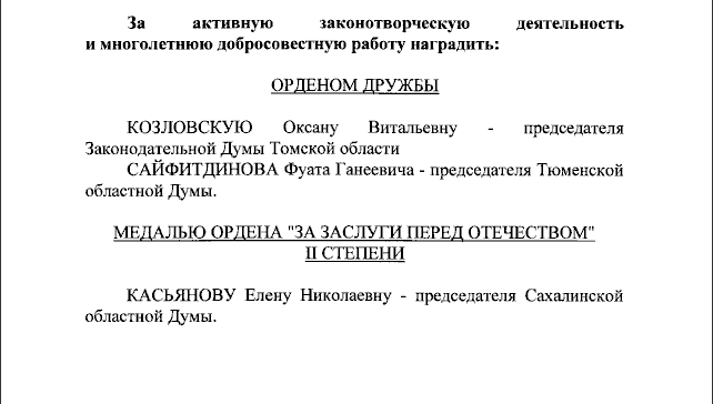 Высокой государственной награды спикер регионального парламента удостоен «за активную законотворческую деятельность и многолетнюю добросовестную работу».