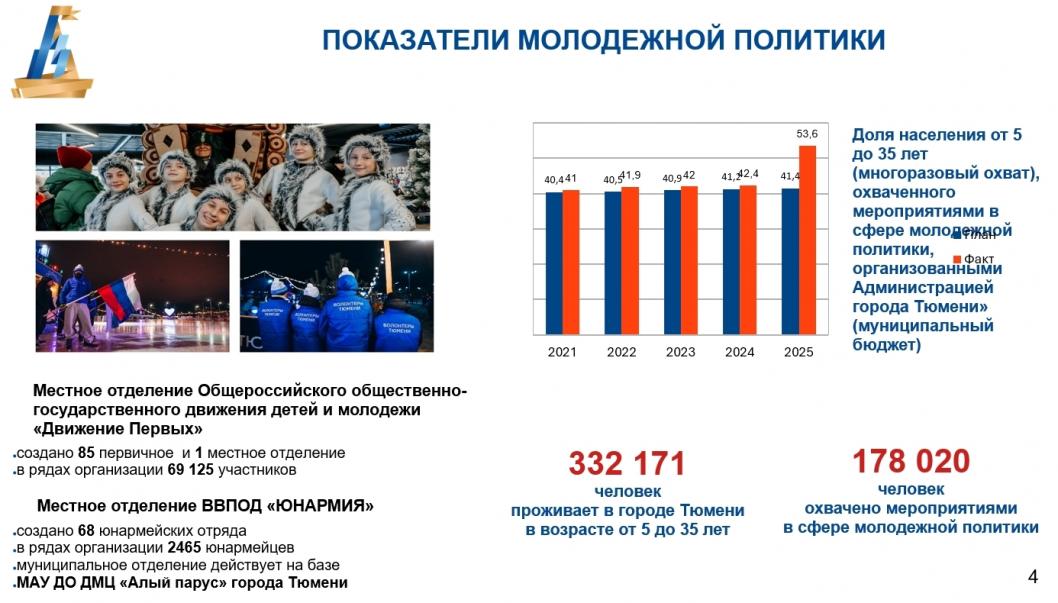 Одним из главных итогов 2025 года стал высокий охват жителей в ходе реализации муниципальной программы в Тюмени «Молодежь Тюмени». Доля жителей в возрасте от 5 до 35 лет, принявших участие в мероприятиях сферы молодежной политики, составила 53,6% при плановом значении 41,4%. В абсолютных цифрах это 178 020 человек. Всего муниципальный план включил порядка 60 крупных событий. Об этом сообщила на заседании постоянной комиссии по социальному развитию Тюменской городской думы директор департамента по спорту и молодежной политике городской администрации Ирина Долгачева. // «Тюменская область сегодня»