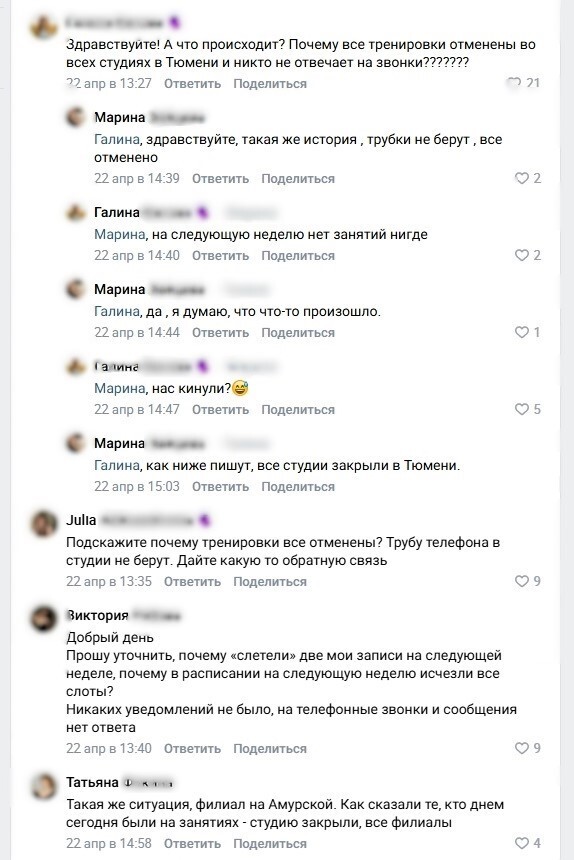 – Я хотела записаться на тренировку, зашла в приложение, а там все тренировки отменены. Зашла в группу студии и увидела, что девочки создали чат по этому поводу. Я приобрела абонемент недавно, он стоил 23600 рублей. Осталось еще 42 посещения. Деньги мне не вернули, они вообще не отвечают на мои сообщения и звонки, – рассказала корреспонденту издания «Тюменская область сегодня» клиентка студии Дарья.